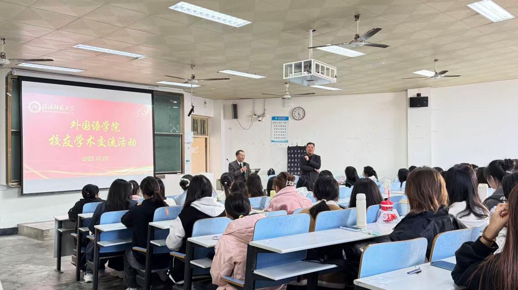 28日下午,“云山忆旧雨,星海照新程”校友专题讲座在人文楼308教室举行,外国语学院本科三年级学生及研究生参加讲座。讲座特邀广东外语外贸大学外语学科领域卓有建树的博士生导师——89级校友陈金诗教授主讲。陈教授结合自身深耕学术、投身教育的历程,聚焦学科前沿、研究方法与职业路径,用鲜活案例为学生解析困惑、指引方向,以“过来人”的智慧照亮学弟学妹前行之路,更以薪火相传之势共促学院高质量发展。